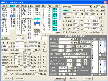 [画面1]データ集計を行いたい条件を指定する。この例では東京ダート1600mの全馬を指定しているが、人気や着順、クラス、単勝オッズなど様々な条件から集計できる。