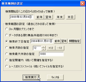 [画面2][検索範囲の指定]で、2004年の1月までさかのぼって検索する例。集計対象となるレース数がに応じて検索時間が変化するので、対象レース数が多くなりそうな場合は期間を短めにしたい。