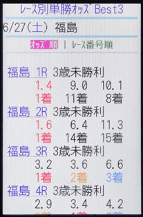 ほかにも、JRA-VANのケータイサービスには便利なオッズ検索機能がいくつもある。例えば、各場のレースごとに上位1〜3番人気の単勝オッズを表示する「レース別単勝オッズBest3」がそのひとつだ(画面3)。単勝上位人気3頭のオッズを見れば、そのレースが混戦模様なのか、2〜3強ムードなのか、それとも「一本かぶり」なのか、ある程度は判断がつくものだ。この「レース別単勝オッズBest3」を見れば、1日24〜36レースの中から皆さんの馬券スタイルに応じて「堅そうなレース」や「荒れそうなレース」を見つけ出す手がかりになるに違いない。