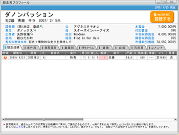 [画面1]JRA-VAN NEXTの「競走馬プロフィール」。画面はインタビューでも名前の挙がったダノンパッションの「競走成績」。タブの切替えでさまざまな情報を表示できる。