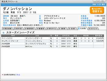 この「兄弟馬」タブで兄弟馬の馬名をクリックすると、さらにその馬の「競走馬プロフィール」が表示される。ある馬からその兄弟へと話題が広がった際、あるいは馬券検討などで大いに役立つことだろう。