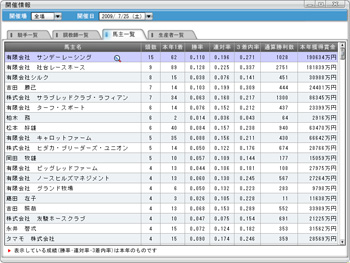 [画面5]「開催情報」画面で「馬主一覧」タブを開いた例。この画面にある馬主以外にも、騎手や調教師、生産者別に、出走情報やその年の成績を確認できる。