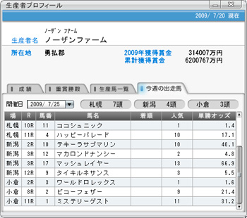 [画面6]より詳しい情報を知りたい場合は、画面5で馬主名や生産者名をクリックする。画面はノーザンファームの「生産者プロフフィール」画面から「今週の出走馬」タブを選択した例。出走馬一覧やその単勝オッズが表示されており、既に終了しているレースがあれば着順もチェック可能だ。