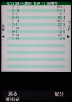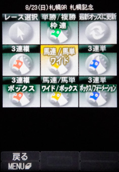 画面2は「オッズ」で札幌記念のオッズを表示する例。馬券種別や、そのオッズの表示方法を選択できるほか、レースの変更(「レース選択」)や、「最新オッズに更新」などが行える。