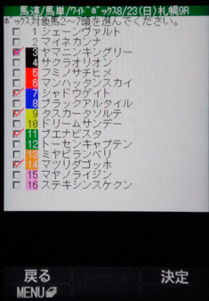 ここで「馬連/馬単/ワイド」の「ボックス」を選んだ例が画面3である。出走馬の一覧が表示されるので、ボックスに加えたい馬にチェックを入れて「決定」を押すと、対象馬のボックス馬券のオッズが表示される(画面4)。