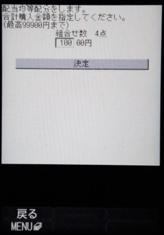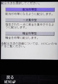 [画面5]オッズ表示から「配分」に進んだ例。「配当均等型」「一点集中型」「賭金均等型」の3種類の配分方法から選択できる。