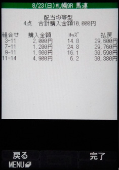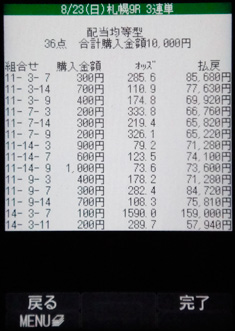 画面7のように4点程度なら暗算でも対応できるが、購入点数が多い場合に「快傑オッズ」は特に有効だ(画面8)。購入点数と予算、オッズの関係で完全に「均等」にならない点には注意が必要だが、競馬場やWINSなどで馬券を購入する際にはぜひとも活用していただきたい。
