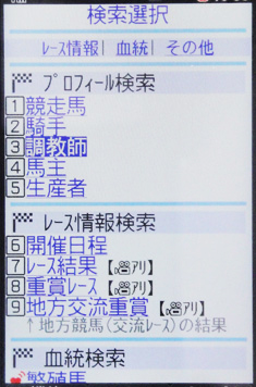 調教師に関するデータの表示は、JRA-VANケータイサービスの「データ検索」コーナーから。[検索選択]にはさまざまな項目が表示されるが、その中の[プロフィール検索]に「調教師」というメニューが用意されている(画面1)。この「調教師」を選択し、調べたい調教師名で検索すると、その調教師のデータが表示される、という手順になる。