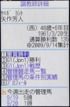 矢作調教師はインタビューにもあったように、JRA-VANは主にケータイサービスを利用されているとのこと。特に「My注目馬」の機能は多く活用されているそうだが、このあたりは以前にも取り上げているため、今回は主に「調教師」関連のデータについて紹介したい。