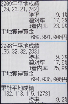 画面2は矢作調教師の「調教師詳細」画面を表示した例。所属や生年月日、通算勝利数などが表示されている。また、この画面を下にスクロールすると、過去2年の成績や、累計成績を見ることも可能だ(画面3)。