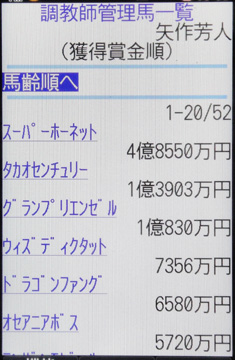 [画面4]画面2から「管理競走馬一覧」を表示した例。この画面は[獲得賞金順]で、スワンSなどを制したスーパーホーネットが矢作厩舎の最上位となっている。