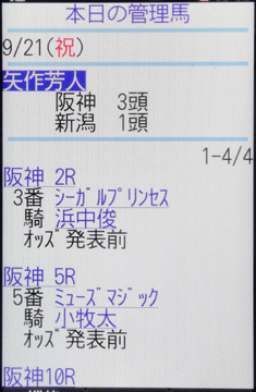 [画面5]同じく画面2から[今週出走の管理馬]を表示したもの。画面は9月21日の例で、各リンクからはレースや馬、騎手の情報へとジャンプすることが可能だ。