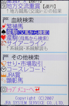 今回はもうひとつ、インタビューにもあった「血統」に関するデータ表示についても紹介したい。表示の方法はいくつかあるが、基本は「データ検索」内の[血統検索]だろう。画面6にある通り、「繁殖馬」「産駒(父馬から検索)」「産駒(母馬から検索)」「サイアーライン」と4つのメニューが用意されている。