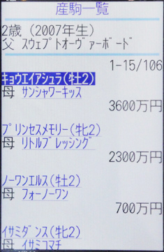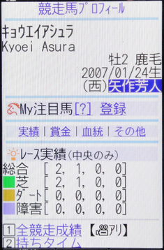 [画面8]画面7でキョウエイアシュラを選び、「競走馬プロフィール」を表示したもの。全成績はもちろん、ほかにもさまざまな情報が閲覧可能だ。