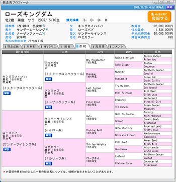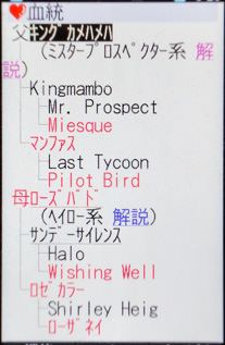 [画面2]「競走馬プロフィール」で[血統]を選択し、系統図を表示した例。リンク形式になっている馬については、別画面で細かな情報を表示可能だ。