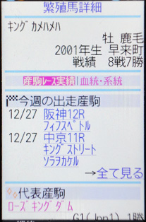 「データ検索」コーナーから競走馬のデータを表示すると、[実績][賞金][血統][その他]とリンクが表示される(画面1)。ここで[血統]を選択したのが画面2で、その馬の系統図が表示される。また、父や母などデータが存在する馬についてはリンク形式になっている。このリンクをたどれば、さらに別の馬の情報を見ることができる形だ。