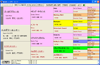 [画面7]TARGET frontierJVの血統表表示例。画面上の配色で[チェック種牡馬]を選択すれば、系統ごとの色分けが可能だ(データが登録されている場合)。