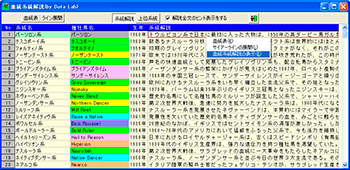 ほかに、[メインメニュー]-[血統系統一覧(JRA-VANデータ)]と選択すると、系統解説を一覧表示できる(画面8)。右クリックで系統解説の全文を表示したり、その系統の種牡馬を一覧表示することが可能だ。この系統解説については、画面7で父名などを右クリックしても閲覧できる。ほかにも「TARGET frontierJV」では種牡馬や母の父、あるいは繁殖牝馬の成績集計などさまざまなデータ分析が行えるため、血統についてより詳しく分析したい場合には大変便利だ。