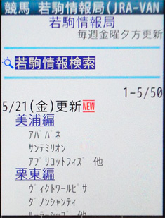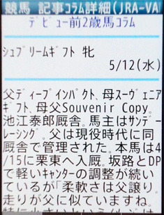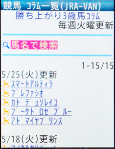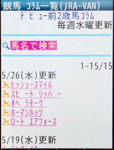 こういった若駒情報は、ケータイサービスではトップページの「ニュース&コラム」のコーナーにまとめて掲載されている。画面1は[デビュー前2歳馬]を選択した例。新馬戦の開始までまだ半月少々ある時期だが、5月中旬から毎週水曜日に5頭づつ、既に15頭の情報が登録されている。
