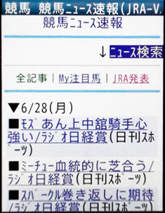 そこで今回は、そのケータイサービスから、まず「競馬ニュース速報」のコーナーを紹介しよう。田中さんが競馬をはじめたころには、競馬週刊誌やスポーツ紙をこまめにチェックして情報を収集されていたそうだが、現在はそれらに加え、インターネットを通じても多くの情報が配信されている。JRA-VANのケータイサービスでは、トップページ「ニュース&コラム」内の[競馬ニュース速報]コーナーで最新の情報を知ることが可能だ。手元に週刊誌や新聞のない移動中などにも、すぐに最新の情報をチェックできるのが、このケータイサービスのニュース速報だ。