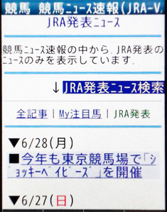 そして画面2は、画面1で[JRA発表]を選択して、JRAから発表されたニュースの一覧を表示したものだ。こちらでは、開催前の馬場情報や、レース前の出走取り消しなどの情報、そして各競馬場やWINSにおけるイベント情報などが掲載されている。それぞれ役立つ情報ばかりだが、特に金曜に発表される各場の馬場情報は、予想にあたって大いに参考になる。