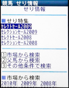 画面3は、ケータイサービスのトップページ「調べる」から[データ検索]→[せり・市場取引]と進んだもの。セレクトセールとセレクションセールについては特集が用意されているほか、その他のせり市については[市場から検索]欄で年ごとに結果を確認できる。