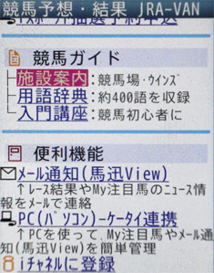 [画面1]ケータイサービス画面のトップページの下方にある「競馬ガイド」のコーナー。用語辞典などのほか、競馬場やウインズへのアクセスなども調べられる。