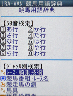 [画面2]用語辞典の検索画面。知りたい用語を調べる際に便利な[50音検索]、競馬を勉強する際に便利な[ジャンル別検索]と2通りの検索ができる。