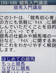 JRA-VANのケータイサービスでは、これらの情報はトップ画面を下にスクロールした部分にある「競馬ガイド」コーナーにまとめられている(画面1)。このコーナーには「施設案内」「用語解説」「入門講座」が用意されており、競馬場やウインズのアクセスなどの情報なら「施設案内」で調べることが可能だ。