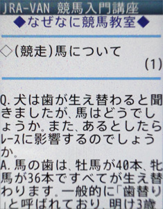 このコーナーは、競馬を一日楽しむ流れを追って解説した「はじめての競馬」(画面4、5)から、競馬に関してよく聞かれる疑問をQ&A形式でまとめた「なぜなに競馬教室」(画面6)、そして競馬の歴史を解説した「競馬小史」など、大きく6つに分かれている。
