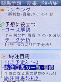 [画面1]ケータイサービスのトップページにある「My注目馬」の項目。ここで[My注目馬の一覧・登録]を選択すると、登録済み「My注目馬」の照会や情報の閲覧、そして新規登録、削除などが可能だ。