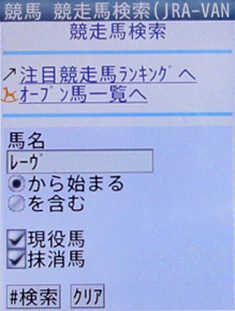 画面2で「My注目馬の登録]を選択すると、「競走馬検索」画面が表示される。ここで入力フィールドに、「My注目馬」登録したい馬の馬名の先頭数文字(または一部分の数文字)を入力し、[#検索]を選択する(画面3)。既に現役登録を抹消された馬も含む場合は[抹消馬]のチェックボックスにもチェックを入れる。