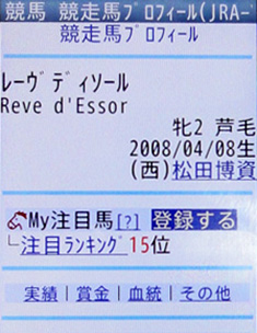 今回は、そんな中から「My注目馬」の登録機能について取り上げたい。これまでも、ケータイサービスを活用されている方のほとんどが利用されていると語っていた、たいへん便利なこの機能。本コーナーでも第4回、松岡正海騎手に登場いただいた際に、その概要は紹介している。ただ、当時は登録方法について画面で解説していなかったので、今回は登録する手順を紹介する。ケータイサービスを利用しているが、まだ「My注目馬」機能は活用されていない、という方は参考にしていただきたい。
