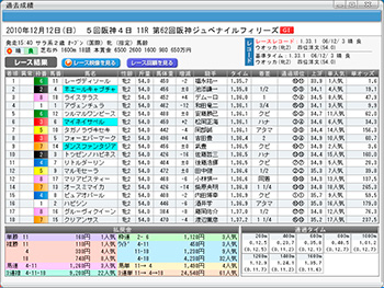 [画面2]ローテーション画面からレース名をクリックすると、[過去成績]画面が表示される。画面はクイーンCから阪神JFの結果を表示したもので、クイーンCに出走する3頭が背景青で表示されている。