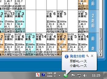画面3は、高尾さんがおっしゃっていた「締め切り○分前」というお知らせ表示。タスクトレイの通知領域からポップアップで表示される。発走何分前に通知するかは設定画面から変更が可能だ。ほかに、馬場状態の変更などといった情報も通知される。