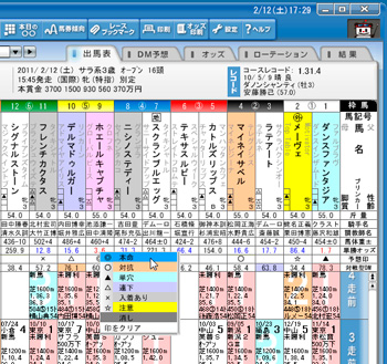 [画面5]出馬表から予想印を入力している例。入力した予想印によって馬名の背景の色が変わる。印と色の対応は「設定」-「予想印」で変更可能だ。