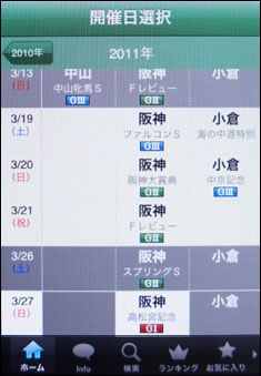 [画面1]開催日選択画面。ここから情報を表示したい日と競馬場を選択する。