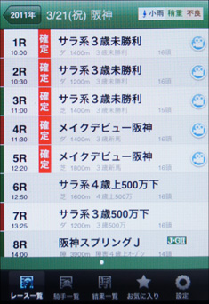 いくつか紹介すると、まず画面1は「開催日選択」画面で、ここで情報を知りたい競馬場と日を選択する。画面2は3月21日の阪神を選択した例で、既に終了して払い戻しなどが発表されたレースは「確定」と表示されている。画面右のカメラのアイコンからは、レース動画も再生可能だ。そして画面3は、レースを選択して出馬表を表示させたもの。一般的なアプリ同様、ここから画面をスクロールすることができ、各馬の騎手や調教師、過去走などの情報を表示できる(画面4)。