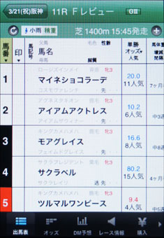 [画面3]フィリーズレビューの出馬表を表示した例。枠順や馬名や父母、オッズなどが表示されているほか、画面を横にスクロールさせれば、各馬の過去走なども閲覧できる。