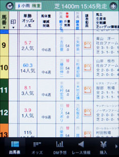 さて、その「JRA-VAN 競馬App」で提供される情報だが、現在開催されている競馬について、オッズや馬体重などリアルタイムのものも含め、ひと通りの情報はしっかり網羅されていると言っていいだろう。操作性は他のiPhoneアプリと同様なので、基本的なiPhoneアプリの利用法を知っていれば、特に戸惑うことはないはずだ。