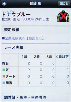 ほかにも、成績の表示(画面7)や、検索機能による競走馬や騎手などの詳細情報表示、そして各種ランキングの検索、さらには「データマイニング」など、さまざまな機能、情報が提供されている「JRA-VAN 競馬App」。まだサービス開始から3ヶ月少々。これからさらに追加される機能もありそうで、iPhoneユーザーの方はぜひご注目いただきたい。