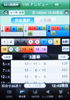 [画面6]同じくフィリーズレビューでオッズを表示したもの。[自由選択]では1着〜3着候補を指定すると、その組み合わせが自動的に抽出されてオッズが表示される。