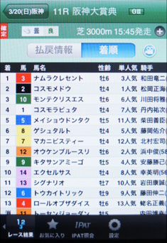 [画面7]こちらは既に終了したレースから、阪神大賞典の全馬着順を表示した例。ほかに、着差や体重の増減などより詳しい情報を含めた成績画面もある。また、ここから画面上で切り替えると払戻情報が表示できる。[着順]の隣にあるボタンからはレース映像も再生可能だ。