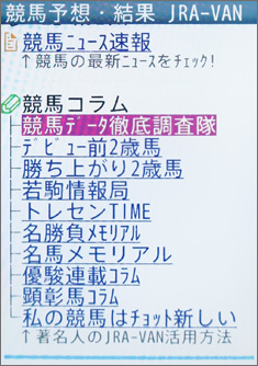 [画面1]ケータイサービス・トップページにある「競馬コラム」コーナー。本文で紹介した「競馬データ徹底調査隊」以外にも、さまざまなコラムが掲載されている。