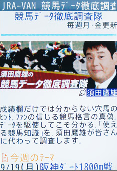 コラムはケータイサービス・トップページの「競馬コラム」コーナーにまとめて掲載されている。画面1のうち「デビュー前2歳馬」「勝ち上がり2歳馬」は以前、さとう珠緒さんの回でも紹介しているので、そちらを参考にしていただきたい。数あるコラムの中でも、「競馬データ徹底調査隊」は竹山さんが最近よく閲覧されているとのこと。このコーナーでは、須田鷹雄さんが毎週月、金曜の2回、馬券検討に役立つデータを紹介している(画面2、3)。読者からのリクエストも受けつけているので、皆さんも「こんなデータを知りたい」「こんな格言があるけど本当なの?」などという疑問、質問があれば、リクエストしてみてはいかがだろうか。