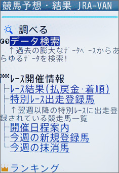 続いてはデータ検索について。ケータイサービスのデータ検索機能では、競走馬や騎手、調教師、そして血統検索など、さまざまな項目について、多くの視点から検索が行える。