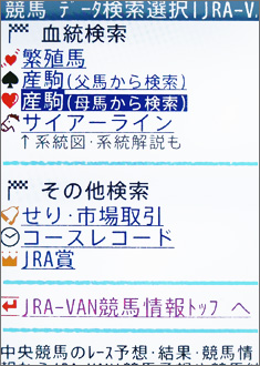 ほかにもケータイサービスには、競走馬にかぎっても数多くの検索方法が用意されている。たとえば「○年の○○セールで気になったあの馬、その後どうなった?」などというときには、「その他検索」の[せり・市場取引]から検索できる。もちろん重賞の勝ち馬などもレースから検索でき、たとえわずかな手がかりしかなくても、目的の馬を効率よく探し出せるのがケータイサービスのデータ検索機能だ。