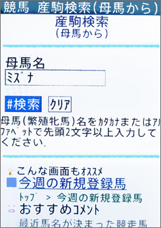 [画面6]産駒検索画面。母馬名(一部でも可)を入力して検索し、検索結果で目的の母馬が出てくれば、産駒一覧を表示できる(→画面7)。もし母馬名を完全に記憶していなくても、頭の数文字がわかれば手がかりを探れる。