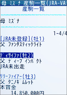 [画面7]母馬名「ミズナ」で産駒の一覧を表示した例。ここから馬名を選択すれば、より詳しい情報が表示される。競走年齢に達していない馬でも、一定の時期を過ぎれば血統や生産者などの情報は確認可能だ。