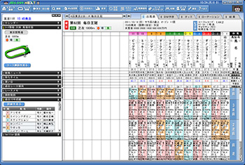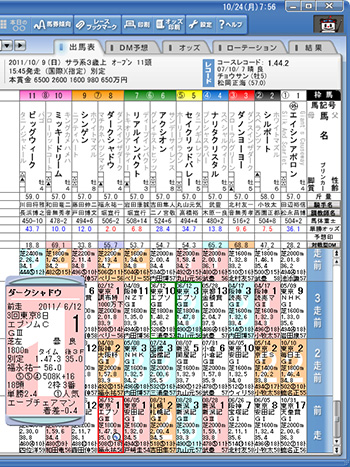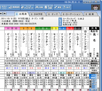 [画面7]出馬表では前走からのレース間隔の表示が追加された。また、この画面では騎手名、調教師名、対戦型DM(データマイニング)、総合成績がボタンになっている。